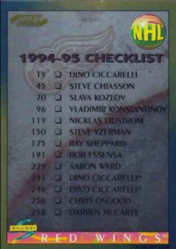 Other popular players in the 1994 Score set include Dino Ciccarelli, Eric Lindros, Bernie Nicholls, Mike Gartner, and Mike Modano.