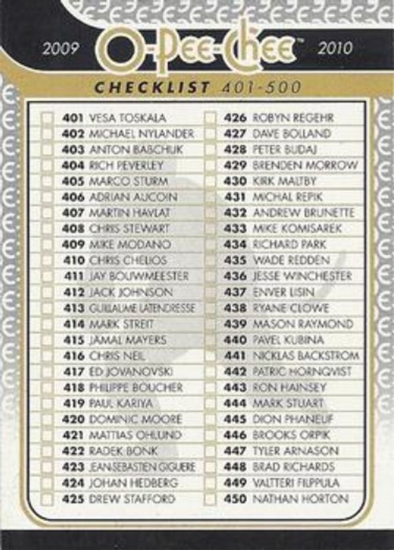 The Checklist 2009 O-Pee-Chee #500 Base card is 1 of 29 Checklist's card variations in the 2009 O-Pee-Chee set being tracked by Sports Card Investor, including #496 Base, #497 Base, #498 Base, #499 Base, and #700 Base.