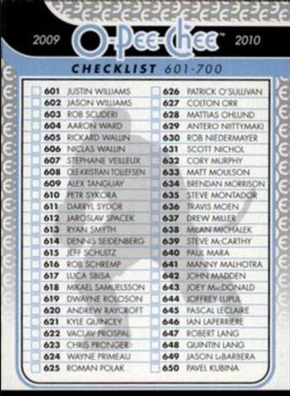 The Checklist 2009 O-Pee-Chee #700 Base card is 1 of 29 Checklist's card variations in the 2009 O-Pee-Chee set being tracked by Sports Card Investor, including #496 Base, #497 Base, #498 Base, #499 Base, and #500 Base.