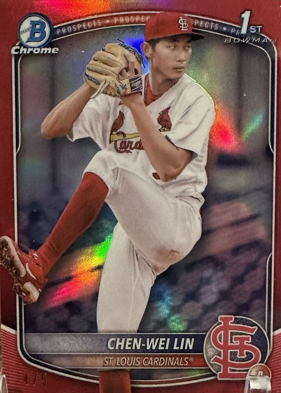 The Chen-Wei Lin 2025 Bowman #BCP-141 Chrome Prospects - Red Refractor /5 (1st) card in Raw condition has not changed in price in the last 30 days and was last sold for $120.00 .