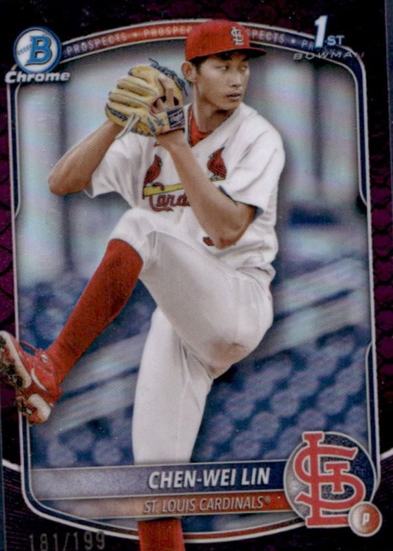The Chen-Wei Lin 2025 Bowman #BCP-141 Chrome Prospects - Reptilian Fushcia Refractor /199 (1st) card in Raw condition has not changed in price in the last 30 days and was last sold for $3.02 .