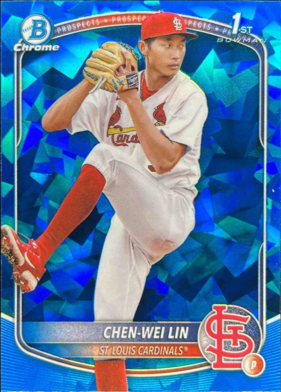 The Chen-Wei Lin 2025 Bowman Sapphire Edition #BCP-141 Chrome Prospects card is 1 of 9 Chen-Wei Lin's card variations in the 2025 Bowman Sapphire Edition set being tracked by Sports Card Investor, including Chrome Prospects - Green Refractor /99, Chrome Prospects - Yellow Refractor /75, Chrome Prospects - Gold Refractor /50, Chrome Prospects - Orange Refractor /25, and Chrome Prospects - Black Refractor /10.