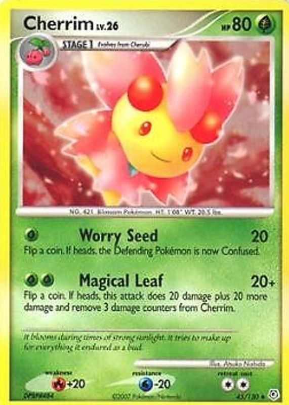 The Cherrim 2007 Diamond & Pearl #045/130 Base card in Raw TCG (Near Mint) condition has moved down -$0.08 (-4.1%) in the last 30 days and was last sold for $1.89 .