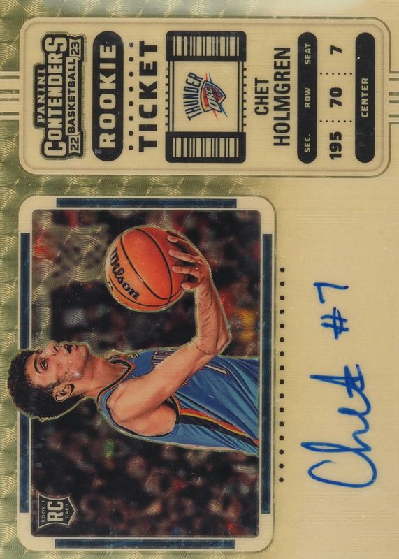 This card is 1 of 27 Chet Holmgren's card variations in the 2022 Contenders set being tracked by Sports Card Investor, including Rookie Ticket Auto, Rookie Ticket Auto - Premium, Rookie Ticket Auto - Premium Green Shimmer, Rookie Ticket Auto - Ticket Stub (/7), and Rookie Ticket Auto Variation.