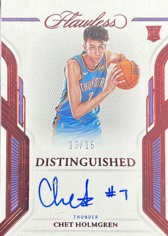 The Chet Holmgren 2022 Flawless #DA-CHG Distinguished Autographs - Ruby /15 Rookie card in Raw condition has not changed in price in the last 30 days and was last sold for $691.00 .