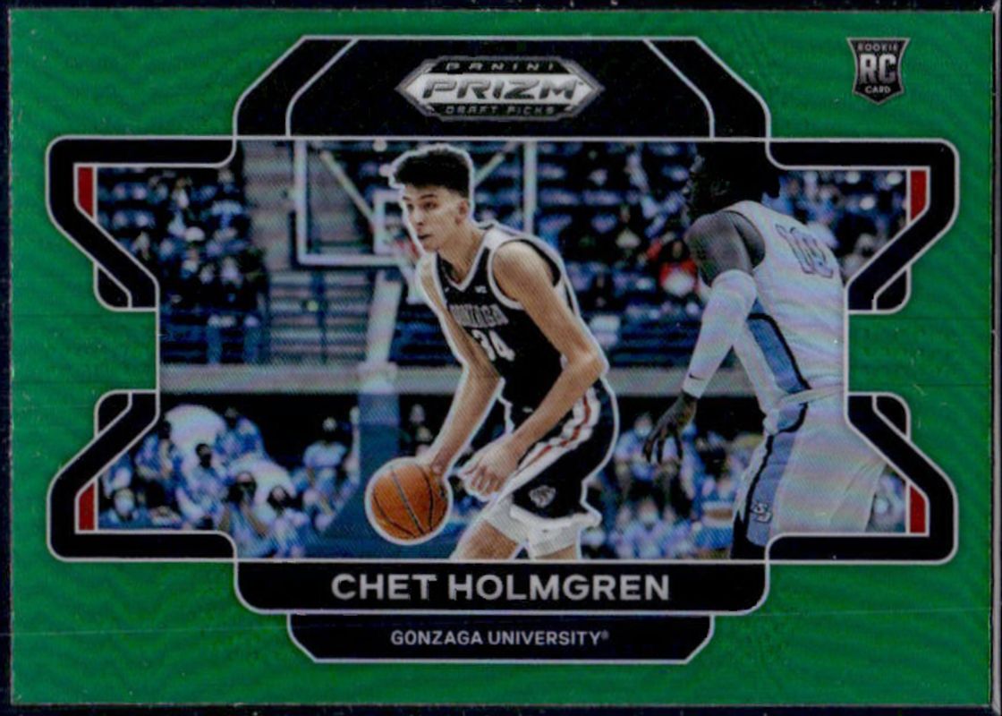 The Chet Holmgren 2022 Prizm Draft Picks #51b Green Rookie card is 1 of 155 Chet Holmgren's card variations in the 2022 Prizm Draft Picks set being tracked by Sports Card Investor, including #51b Base, #51 Base, #51 Blue Circles, #51b Choice Blue Yellow & Green, and #51 Choice Blue Yellow & Green.