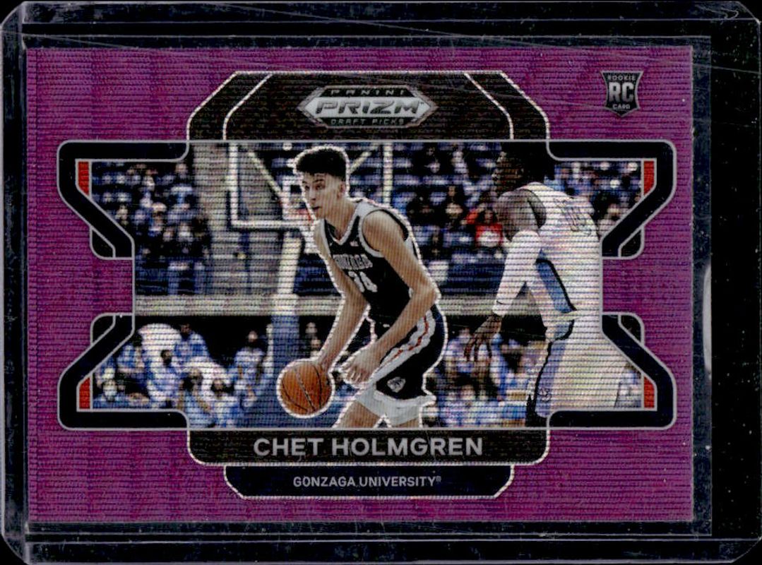 The Chet Holmgren 2022 Prizm Draft Picks #51b Purple Wave Rookie card is 1 of 155 Chet Holmgren's card variations in the 2022 Prizm Draft Picks set being tracked by Sports Card Investor, including #51b Base, #51 Base, #51 Blue Circles, #51b Choice Blue Yellow & Green, and #51 Choice Blue Yellow & Green.