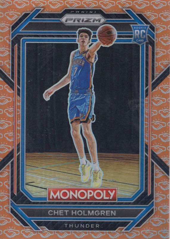 The Chet Holmgren 2022 Prizm Monopoly #63 Handshake Deal Rookie card in Raw condition has not changed in price in the last 30 days and was last sold for $249.99 .