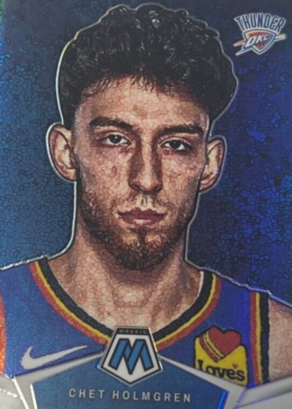 This card is 1 of 26 Chet Holmgren's card variations in the 2023 Mosaic set being tracked by Sports Card Investor, including Choice Peacock /(SSP), Genesis /(SSP), Glitter /(SSP), White Sparkle /(SSP), and Fast Break Gold /10.