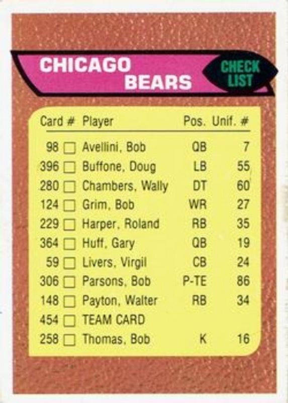 Chicago Bears 1976 Topps #454 Team Checklist RAW Price Guide