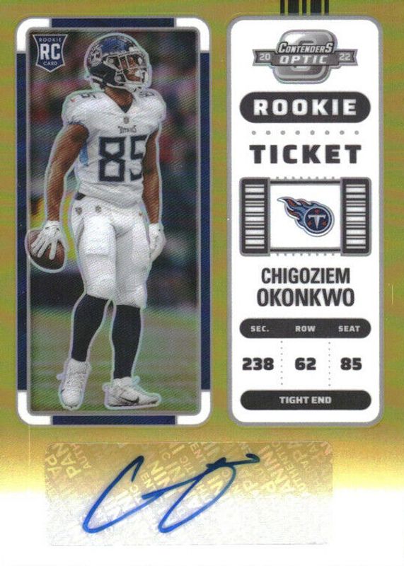 The Chigoziem Okonkwo 2022 Contenders Optic #151 Rookie Ticket Auto - Gold /10 card in Raw condition has not changed in price in the last 30 days and was last sold for $110.00 .