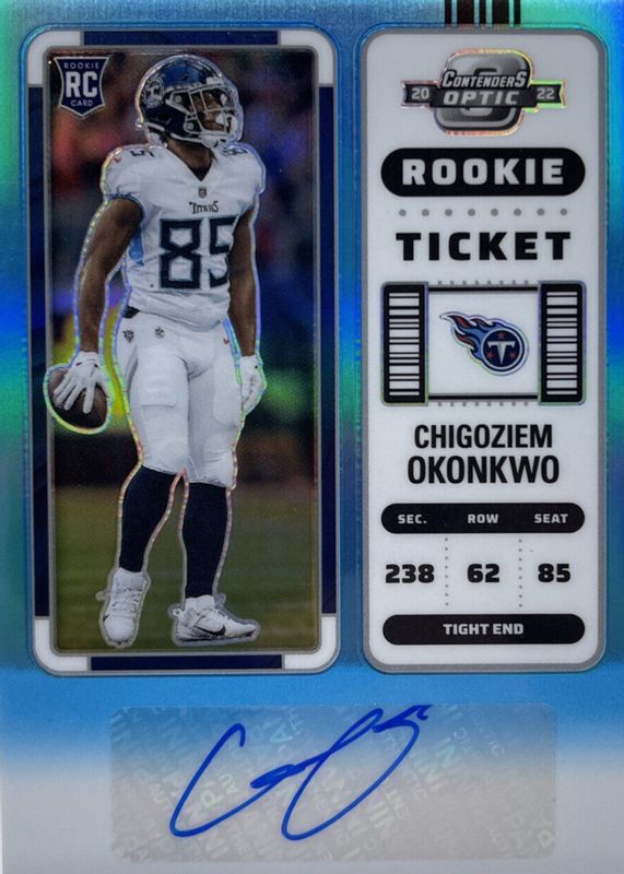 This card is 1 of 11 Chigoziem Okonkwo's card variations in the 2022 Contenders Optic set being tracked by Sports Card Investor, including Rookie Ticket Auto, Rookie Ticket Auto - Silver, Rookie Ticket Auto - Blue /75, Rookie Ticket Auto - Orange /50, and Rookie Ticket Auto - Green Pulsar /30.