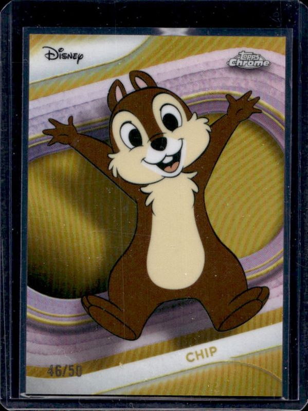 The Chip 2025 Topps Chrome Disney #26 Gold Refractor /50 card is 1 of 37 Chip's card variations in the 2025 Topps Chrome Disney set being tracked by Sports Card Investor, including Base, Mini Diamonds Refractor, Prism Refractor, Refractor, and Yellow Mini Diamonds Refractor.