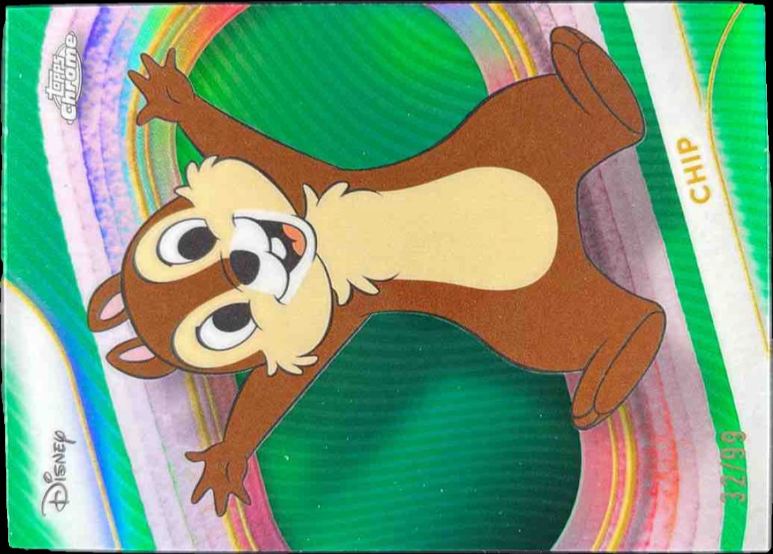 The Chip 2025 Topps Chrome Disney #26 Green Refractor /99 card is 1 of 37 Chip's card variations in the 2025 Topps Chrome Disney set being tracked by Sports Card Investor, including Base, Mini Diamonds Refractor, Prism Refractor, Refractor, and Yellow Mini Diamonds Refractor.