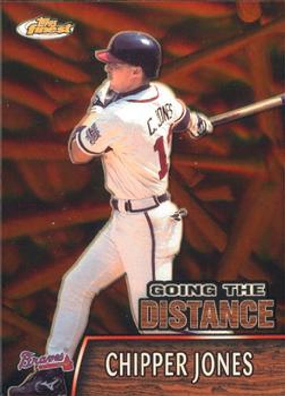 The Chipper Jones 2000 Topps Finest #GTD4 Going the Distance card is 1 of 15 Chipper Jones' card variations in the 2000 Topps Finest set being tracked by Sports Card Investor, including #2 Base, #138 Base, #138 Gold Refractor /100, #2 Gold Refractor /100, and #BB1 Ballpark Bounties.