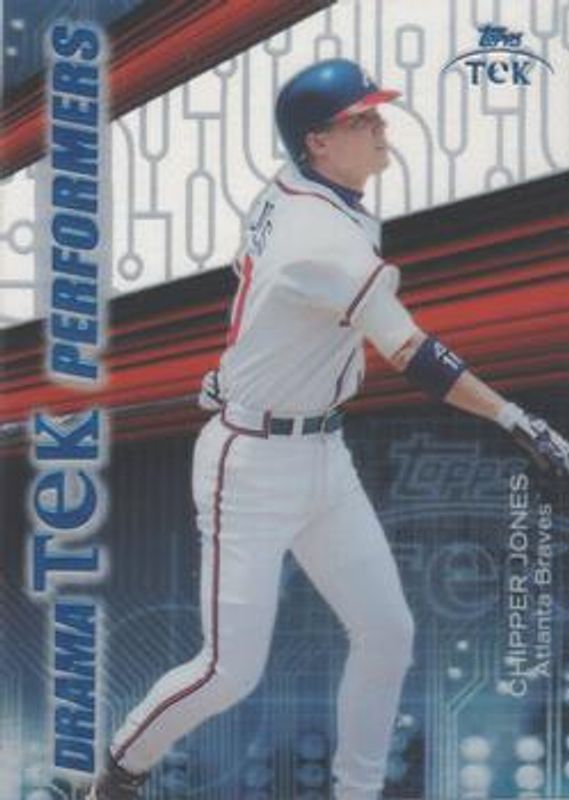 The Chipper Jones 2000 Topps Tek #DP5 DramaTEK Performers card is 1 of 43 Chipper Jones' card variations in the 2000 Topps Tek set being tracked by Sports Card Investor, including Base /2000, Pattern 02 /2000, Pattern 03 /2000, Pattern 04 /2000, and Pattern 05 /2000.