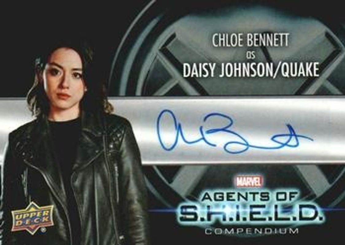 The Chloe Bennet 2019 Upper Deck Agents of SHIELD Compendium #AA-CB Autographs card is 1 of 5 Chloe Bennet's card variations in the 2019 Upper Deck Agents of SHIELD Compendium set being tracked by Sports Card Investor, including Autographs, Character Profiles Autographs, Character Profiles Autographs Variant Achievement, and Quad Autographs Achievement.