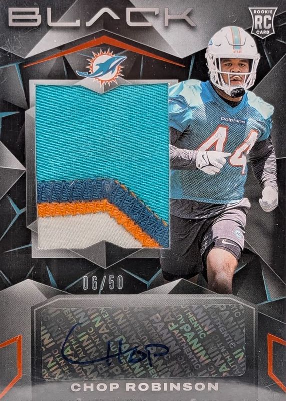 This card is 1 of 7 Chop Robinson's card variations in the 2024 Black set being tracked by Sports Card Investor, including Rookie Patch Auto (/249), Rookie Patch Auto - Royal (/150), Rookie Patch Auto - Emerald /25, Rookie Patch Auto - Ruby /15, and Rookie Patch Auto - Gold /10.