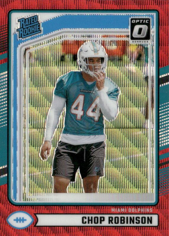 The Chop Robinson 2024 Donruss #351 Optic Preview - Red Wave Rookie card in Raw condition has not changed in price in the last 30 days and was last sold for $3.00 .