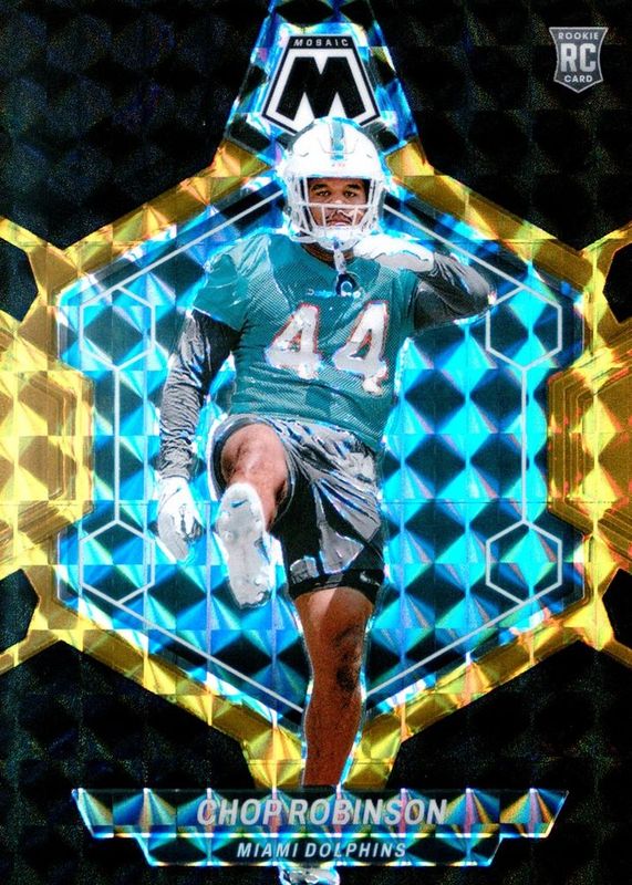 This card is 1 of 61 Chop Robinson's card variations in the 2024 Mosaic set being tracked by Sports Card Investor, including Base, Green, Mosaic, No Huddle, and Pink Camo.