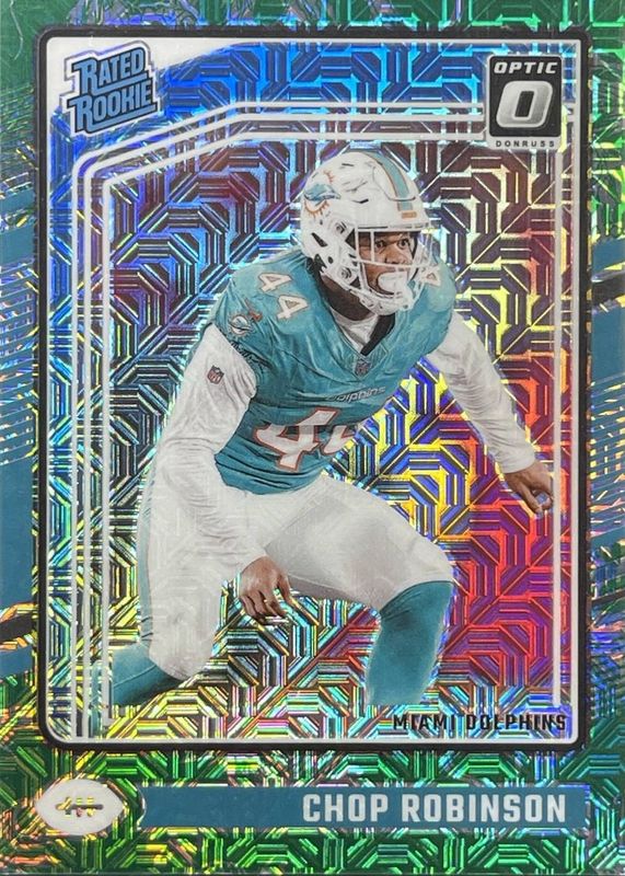 The Chop Robinson 2024 Optic #219 Dragon /24 Rookie card in Raw condition has not changed in price in the last 30 days and was last sold for $70.00 .