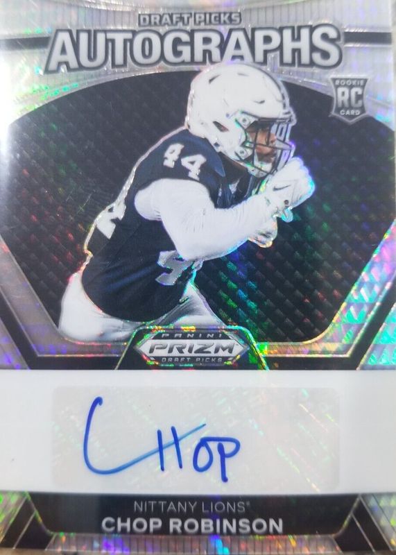 The Chop Robinson 2024 Prizm Draft Picks #DPA-CRN Draft Picks Autographs - Hyper Rookie card in Raw condition has not changed in price in the last 30 days and was last sold for $5.50 .