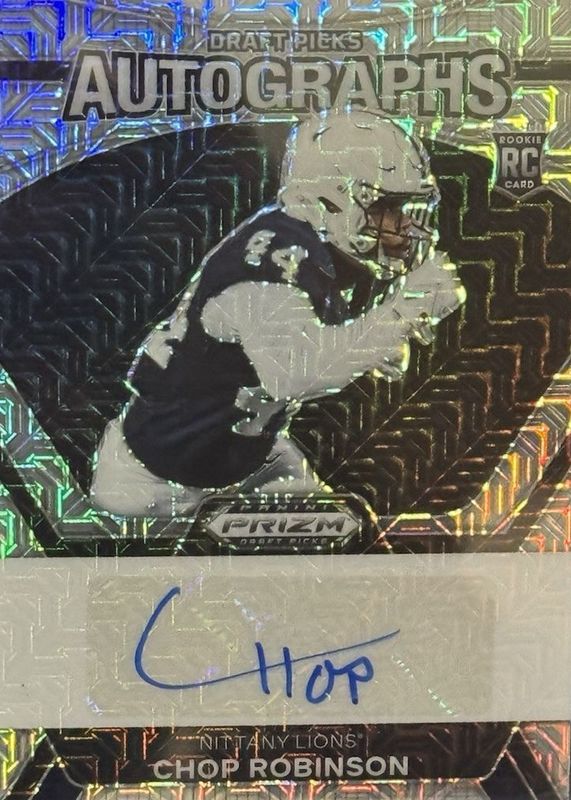 The Chop Robinson 2024 Prizm Draft Picks #DPA-CRN Draft Picks Autographs - Mojo /25 Rookie card in Raw condition has not changed in price in the last 30 days and was last sold for $10.00 .