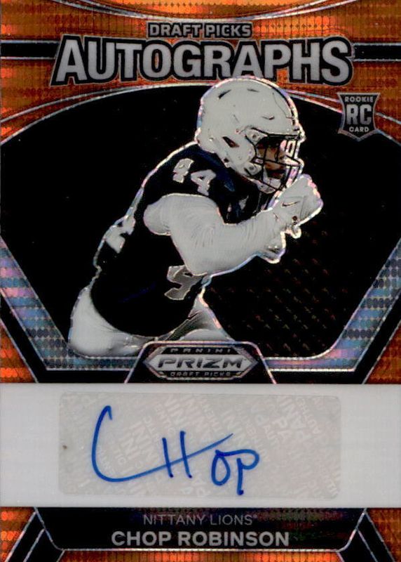 The Chop Robinson 2024 Prizm Draft Picks #DPA-CRN Draft Picks Autographs - Orange Pulsar /49 Rookie card in Raw condition has not changed in price in the last 30 days and was last sold for $13.00 .