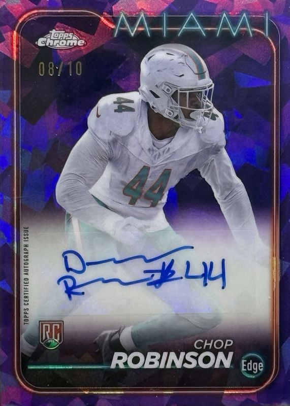The Chop Robinson 2024 Topps Chrome Sapphire Edition #RA-CRO Rookie Autographs - Purple /10 card in Raw condition has not changed in price in the last 30 days and was last sold for $50.00 .