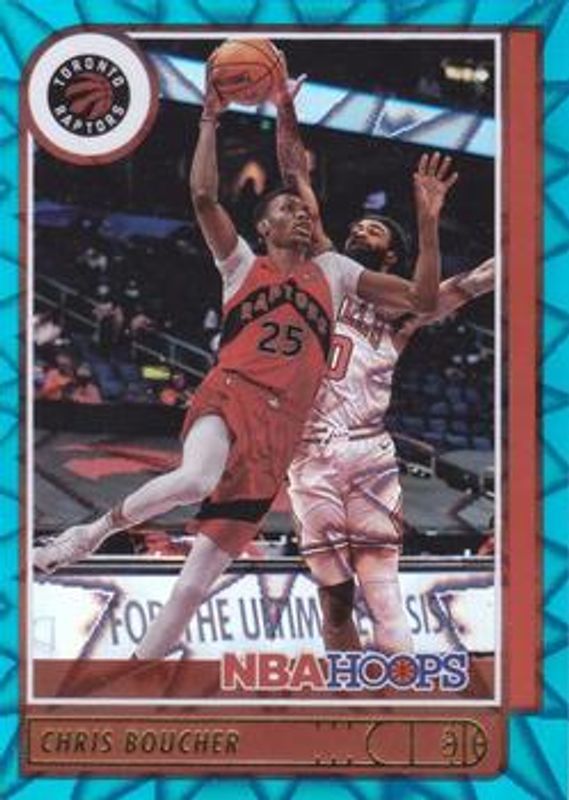 The Chris Boucher 2021 Hoops #129 Teal Explosion card is 1 of 24 Chris Boucher's card variations in the 2021 Hoops set being tracked by Sports Card Investor, including Base, Anniversary Edition, Blue, Green Ice, and Hyper Blue.