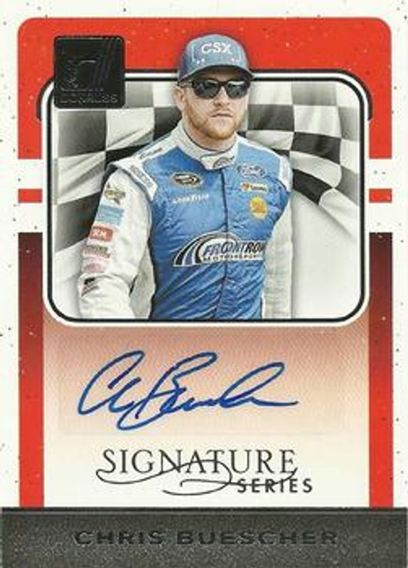 The Chris Buescher 2017 Donruss NASCAR #SS-SB Signatures Series card is 1 of 37 Chris Buescher's card variations in the 2017 Donruss NASCAR set being tracked by Sports Card Investor, including #135 Base, #62 Base, #22 Base, #135 Gold Foil /499, and #62 Gold Foil /499.