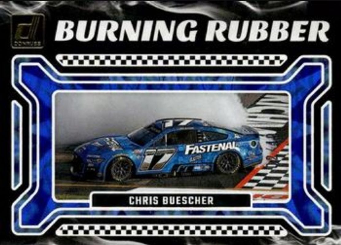 The Chris Buescher 2024 Donruss NASCAR #11 Burning Rubber Blue Xplosion /49 card is 1 of 120 Chris Buescher's card variations in the 2024 Donruss NASCAR set being tracked by Sports Card Investor, including #45 Base, #173 Base, #87 Base, #87 Optic, and #45 Optic.