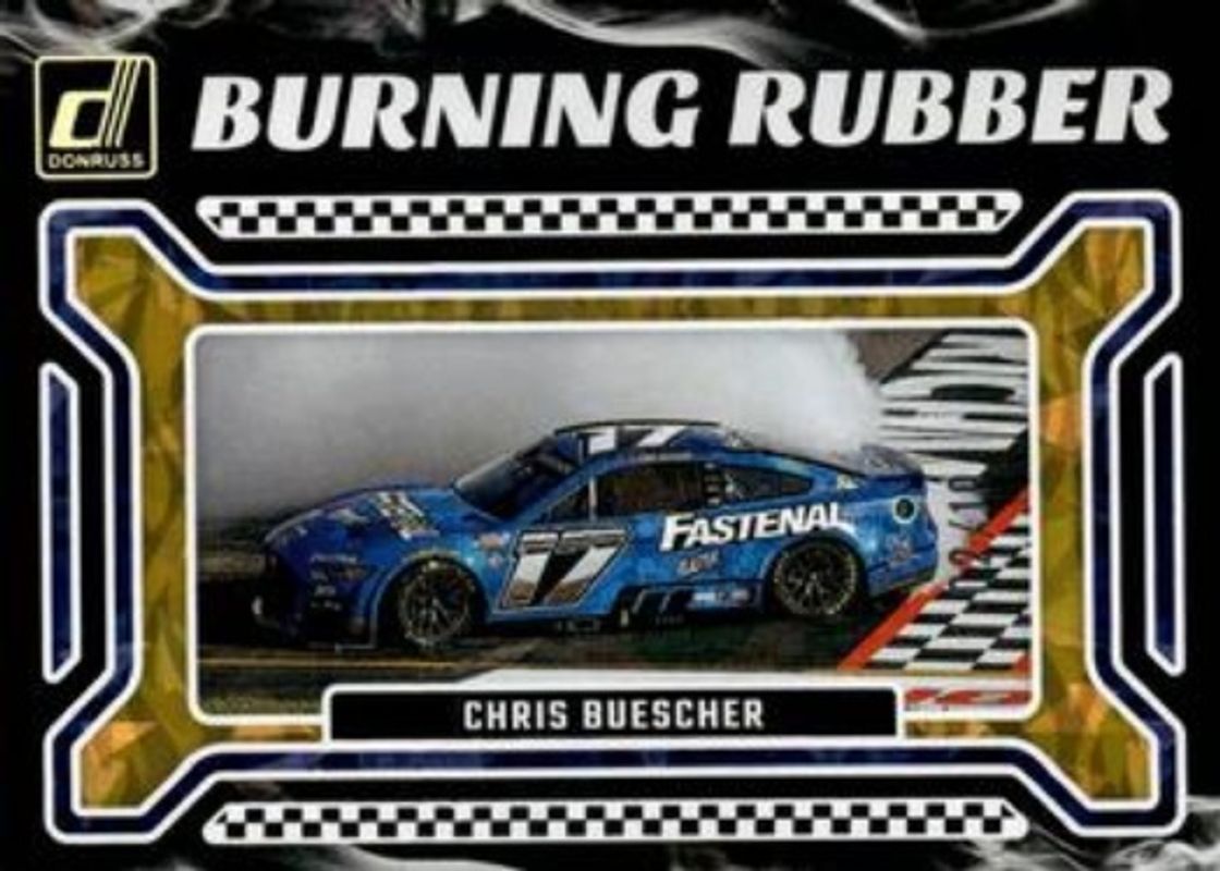 The Chris Buescher 2024 Donruss NASCAR #11 Burning Rubber Gold Ice /10 card is 1 of 120 Chris Buescher's card variations in the 2024 Donruss NASCAR set being tracked by Sports Card Investor, including #45 Base, #173 Base, #87 Base, #87 Optic, and #45 Optic.