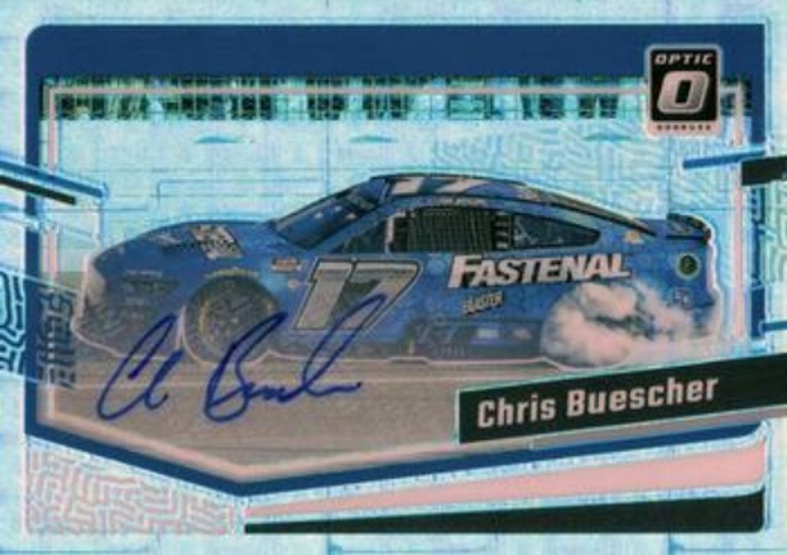 The Chris Buescher 2024 Donruss NASCAR #87 Optic Signatures Pandora /25 card is 1 of 120 Chris Buescher's card variations in the 2024 Donruss NASCAR set being tracked by Sports Card Investor, including #45 Base, #173 Base, #87 Base, #87 Optic, and #45 Optic.