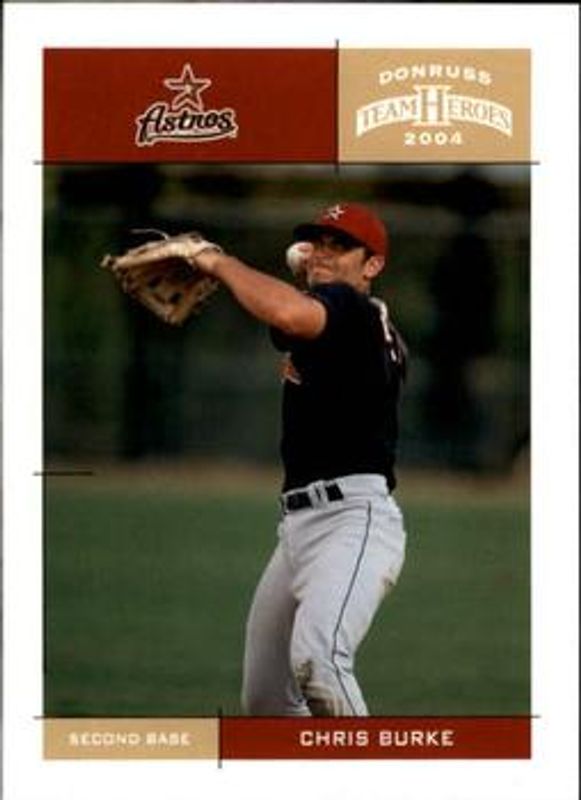 The Chris Burke 2004 Donruss Team Heroes #189 Base card is 1 of 5 Chris Burke's card variations in the 2004 Donruss Team Heroes set being tracked by Sports Card Investor, including Showdown - Bronze /150, Showdown - Silver /50, Showdown - Gold /10, and Autographs /10.