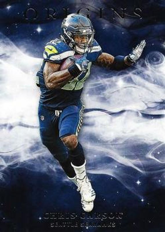 The Chris Carson 2019 Origins #97 Base card is 1 of 13 Chris Carson's card variations in the 2019 Origins set being tracked by Sports Card Investor, including Red /299, Orange /175, Blue /99, Turquoise /25, and FOTL Purple /13.