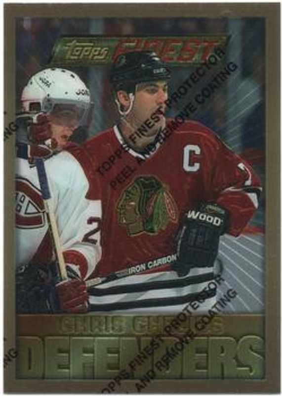 The Chris Chelios 1995 Topps Finest #19 Base card is 1 of 4 Chris Chelios' card variations in the 1995 Topps Finest set being tracked by Sports Card Investor, including #121 Base, #121 Refractor, and #19 Refractor.