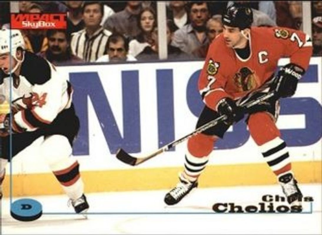 The Chris Chelios 1996 Skybox Impact #18 Base card is 1 of 3 Chris Chelios' card variations in the 1996 Skybox Impact set being tracked by Sports Card Investor, including BladeRunners, and NHL on FOX.