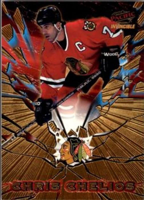 The Chris Chelios 1997 Pacific Invincible #6 Feature Performers card is 1 of 8 Chris Chelios' card variations in the 1997 Pacific Invincible set being tracked by Sports Card Investor, including Base, Copper, Emerald Green, Ice Blue, and Red.