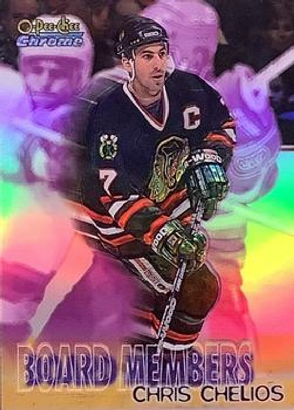 The Chris Chelios 1998 O-Pee-Chee Chrome #B2 Board Members Refractor card is 1 of 4 Chris Chelios' card variations in the 1998 O-Pee-Chee Chrome set being tracked by Sports Card Investor, including Base, Refractor, and Board Members.