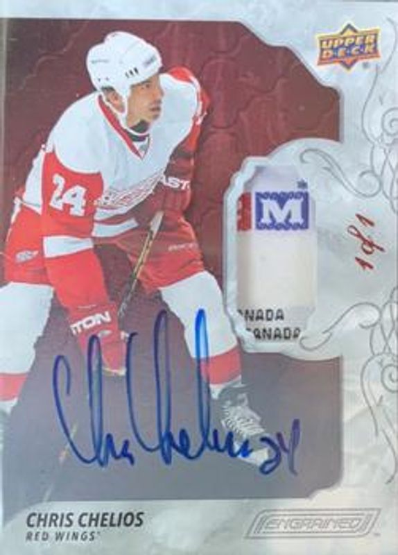 The Chris Chelios 2019 Upper Deck Engrained #33 Rosewood Premium Materials Auto /1 card is 1 of 17 Chris Chelios' card variations in the 2019 Upper Deck Engrained set being tracked by Sports Card Investor, including Base /299, Ebony /49, Mahogany /10, Rosewood /1, and Carved in Time.
