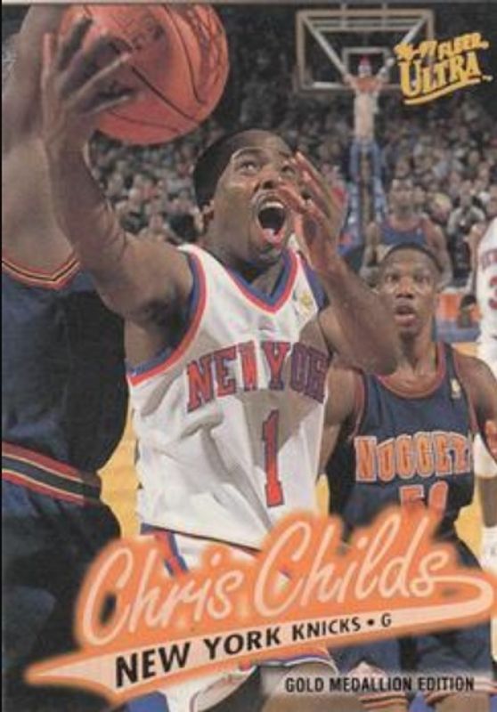 The Chris Childs 1996 Fleer Ultra #G-219 Gold Medallion card is 1 of 3 Chris Childs' card variations in the 1996 Fleer Ultra set being tracked by Sports Card Investor, including Base, and Platinum Medallion.
