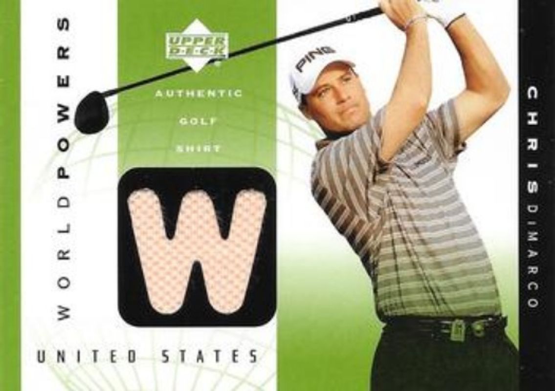 The Chris DiMarco 2003 Upper Deck #WP1-CD World Powers Single Shirts card is 1 of 7 Chris DiMarco's card variations in the 2003 Upper Deck set being tracked by Sports Card Investor, including #5 Base, #64 Base, #93 Base, #CC-CD Collared Classics, and #WP2-DM/SM World Powers Double Shirts.