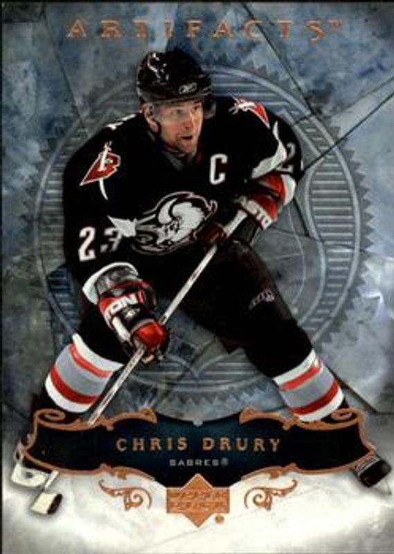 The Chris Drury 2006 Upper Deck Artifacts #89 Base /999 card is 1 of 22 Chris Drury's card variations in the 2006 Upper Deck Artifacts set being tracked by Sports Card Investor, including Silver /100, Gold /50, Bronze /25, Platinum /10, and Radiance /1.