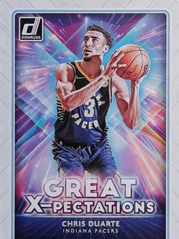 The Chris Duarte 2021 Donruss #25 Great X pectations Rookie card is 1 of 61 Chris Duarte's card variations in the 2021 Donruss set being tracked by Sports Card Investor, including Base, Choice, Green Ice, Green Laser, and Green & Yellow Laser.
