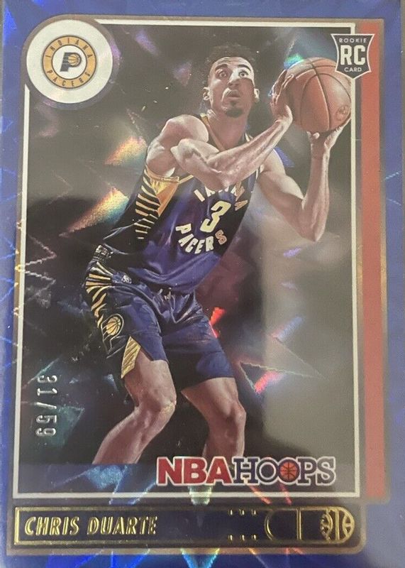 The Chris Duarte 2021 Hoops #236 Blue Explosion /59 Rookie card in Raw condition has not changed in price in the last 30 days and was last sold for $19.99 .