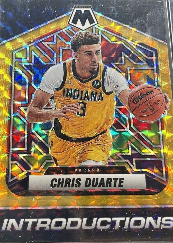 The Chris Duarte 2021 Mosaic #10 Introductions - Gold /10 Rookie card in Raw condition has not changed in price in the last 30 days and was last sold for $19.99 .