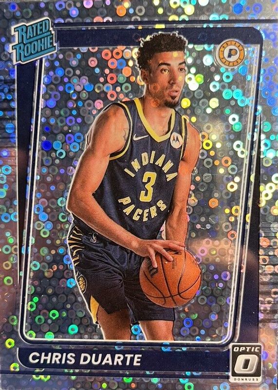 This card is 1 of 43 Chris Duarte's card variations in the 2021 Optic set being tracked by Sports Card Investor, including Base, Blue Pulsar, Blue Velocity, Checkerboard, and Choice Red & Green.