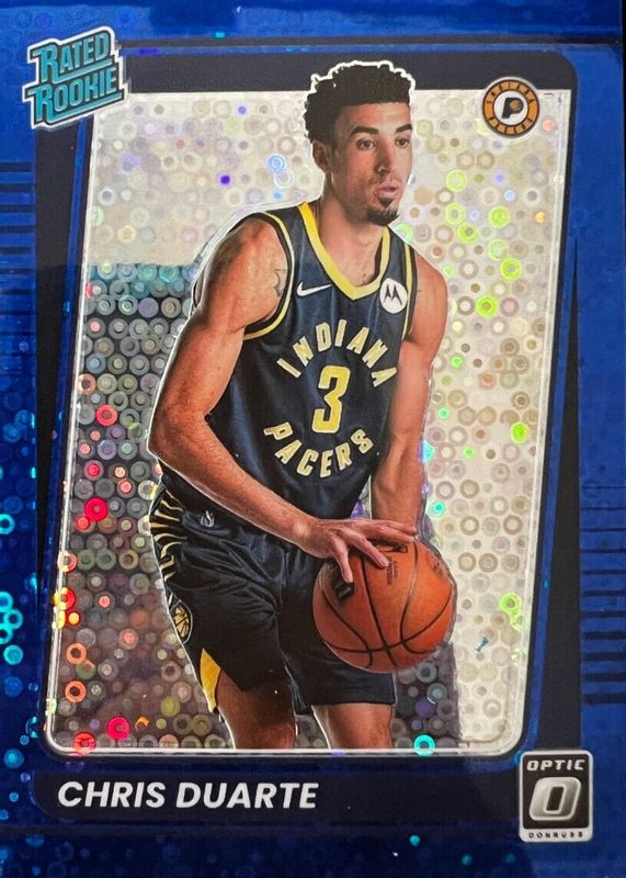This card is 1 of 43 Chris Duarte's card variations in the 2021 Optic set being tracked by Sports Card Investor, including Base, Blue Pulsar, Blue Velocity, Checkerboard, and Choice Red & Green.