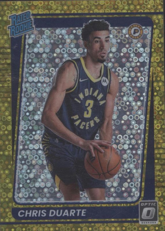 The Chris Duarte 2021 Optic #173 Fast Break Gold /10 Rookie card in Raw condition has not changed in price in the last 30 days and was last sold for $21.50 .